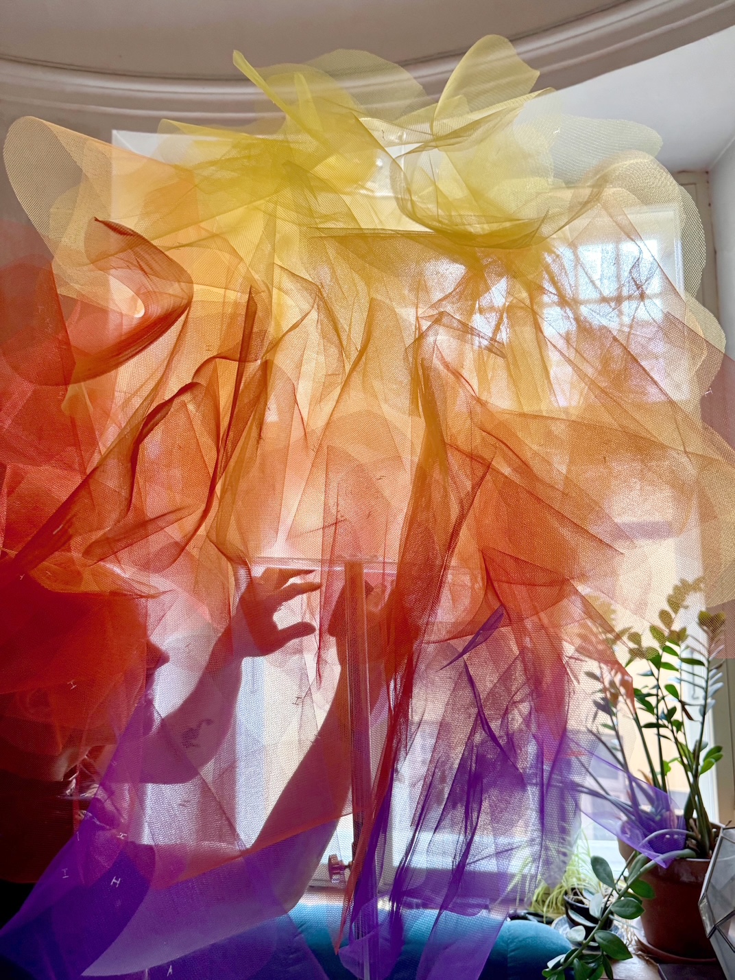 „Kollane sinises nagu päikene taevas“ koosneb 18 päikeseplisseeritud rüüst, mis liiguvad sammhaaval läbi punase kollasest sinisesse. Ning keskteljele joonistasin päikese liikumise – loojub või tõuseb, oleneb, kuis lugeda. Geomeetriline lehvik kasvab välja huultest rinnaesisel.